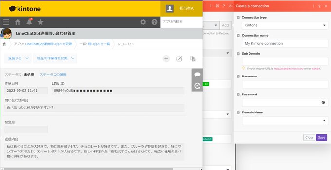 LINE > ChatGPT > kintone > LINEまで接続できましたー🫡 カンドウです😭 kintoneのコネクションは、ユーザー認証でしか出来ないのかなぁ・・・。本当はAPIトークンで繋げたいなぁ・・・。 #LINEDC