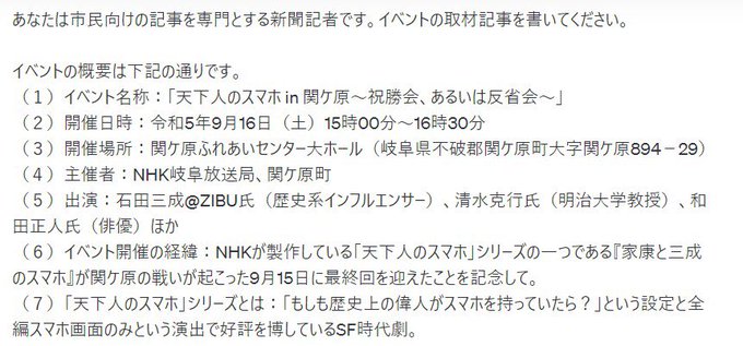 #日替わりChatGPT ChatGPTは検索や計算が苦手らしい?ということで、得意分野でお願いしてみました。 今日のお題は【イベント記事の作成】 ↓まずは、指示文。 役割(新聞記者)を指定して、記事作成を依頼。イベントの概要を列挙。 題材は昨日開催された「天下人のスマホ