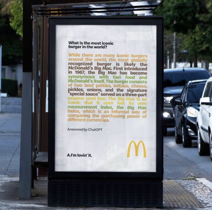「世界で最もアイコニックなハンバーガーは?」 流行りのChatGPTを使って作られたマクドナルドの広告。もちろんその答えは「ビッグマック」。流行り物をうまく取り入れながら、マクドナルドらしい結論に持っていく技はお見事。i'm