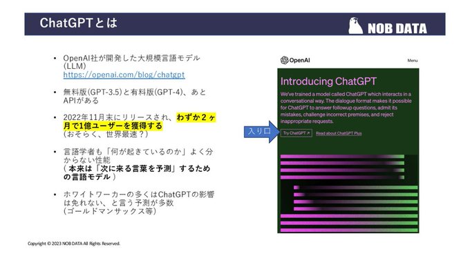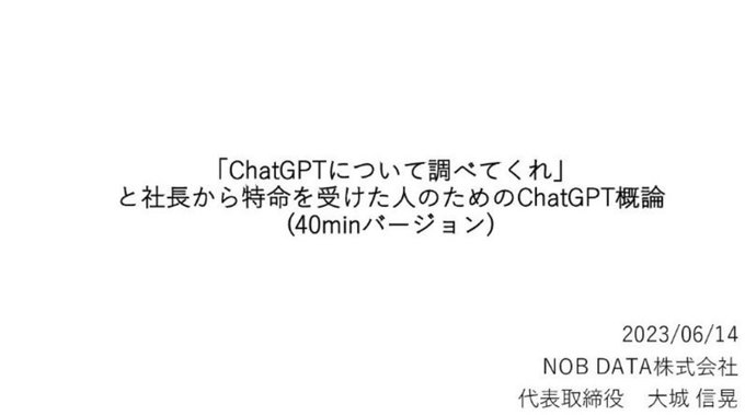 「ChatGPTについて調べてくれ」と社長から特命を受けた人のためのChatGPT概論🤗とても分かりやすくまとめられている✨自分の上司への説明にも使いたい素晴らしい資料🌟 ・ChatGPTとは ・何ができるのか ・ビジネス界への影響 ・プラグインの利用例 ・情報漏洩への対策 等 https://t