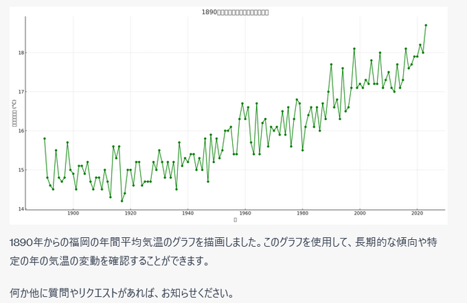 ChatGPTに福岡の年間平均気温をプロットしてもらったら、温暖化・・・・となっている https://t