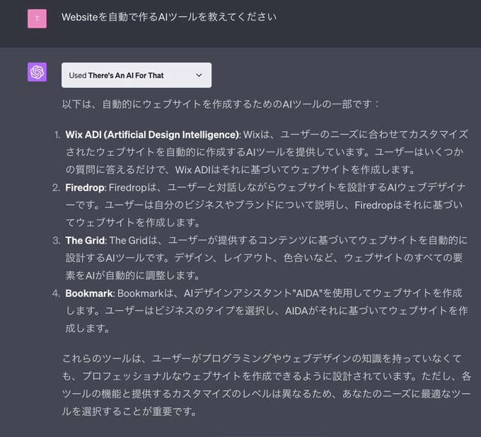 ChatGPTのプラグイン、 「There's An AI For That」がかなり便利。 やりたい作業を伝えるだけで、最適なAIツールを教えてくれる。 世の中にはたくさんAIツールがあっても、どれを使っていいかは分かりづらいので、とりあえず雑にこれに聞いちゃうのが良さそう。