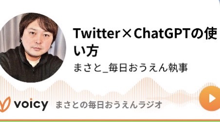 おはようございます! 本日もVoicy投稿しました!テーマは「Twitter×ChatGPTの使い方」ということで、ChatGPTを使って僕がどうやってツイートを作っているのかを暴露してます♪ぜひ、参考にしていただいて、たくさんツイートしてもいてください!視聴はプロフからどうぞ。 #おは戦50618jn