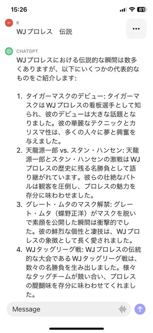 なにぃ〜! あの幻の団体『WJプロレス』のリングにおいて、グレート・ムタが素顔を晒したら…正体は蝶野正洋だったというハプニングがあった⁉︎ いま話題の「ChatGPT」に、WJの伝説を質問したら、ど真ん中じゃない珍回答を連発しました(笑) WJはAIでも解読不能? 驚きの答えは以下↓ #WJプロレス