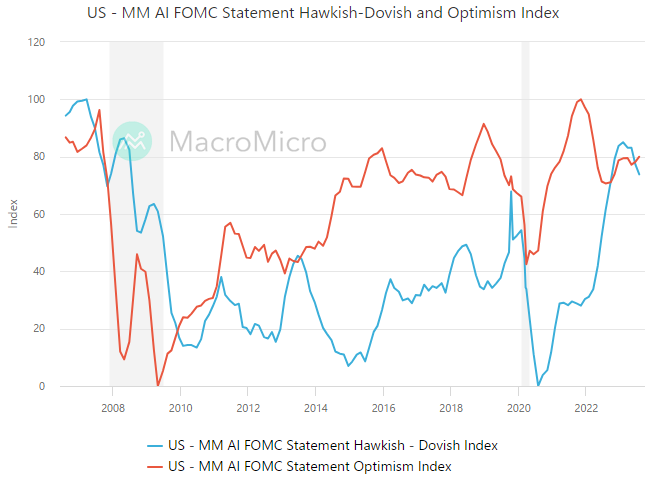 MacroMicroが公開しているこの指標めっちゃ便利。 FOMCの結果がタカ派・ハト派のどちらに傾いたのか、景気見通しのスタンスがどう変化したのかを視覚化してくれています。 ChatGPTを使ってFOMCのステートメントを分析しているようです。