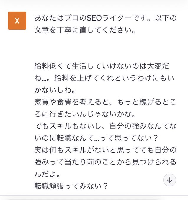 これ意識低いプロンプトなんですけど ・目の前にいる友人が悩んでる時を想定する ・「自分ならこう言う」って文章で書く ・ChatGPTに「あなたはSEOライターです。以下の文章を丁寧に直して」と命令する そうすると5割くらいは使える文章が出てくる。