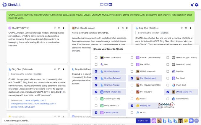 ChatALL:免费多合一AI机器人客户端 允许用户同时向多个AI机器人提问 通过对比多个机器人回答获取最佳答案 支持ChatGPT、Bing、Bard、 Claude、讯飞星火等10+平台 👉https://t