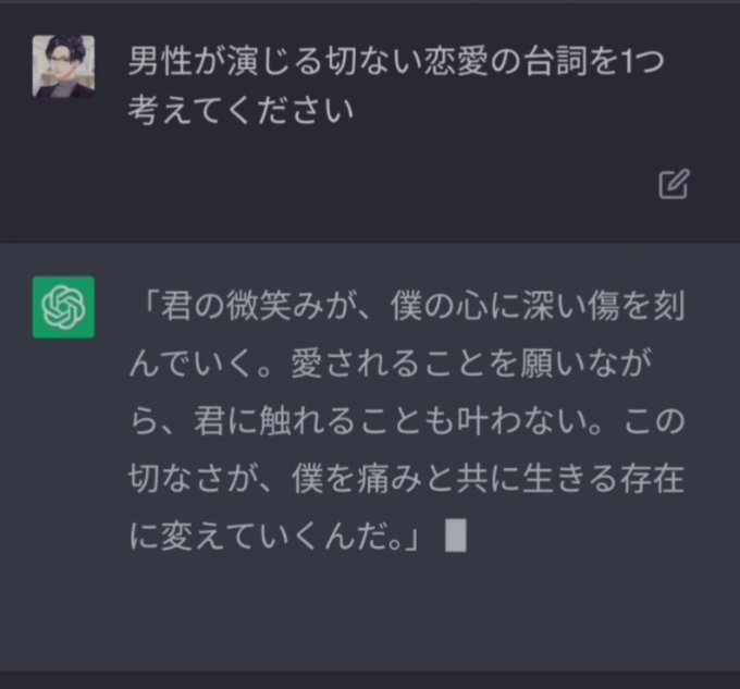 tiktokに投稿させて頂きました! chatGPTにかいて貰った切ない恋愛の台詞を演じてみた ↓ https://t