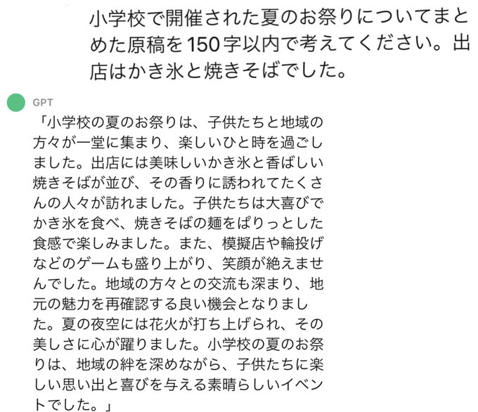 これは絶対に怒られるから内緒なんだけど、どうせ誰も読まない学校行事の会報の原稿はchatGPTで作れるのでは?と試しにやってみたら、これだけの少ない情報で一瞬でそれっぽい文章を考えてくれた。これに少し修正したりオリジナルを加えればもうそれっぽく完成してしまう。すごい、もう勝てそうにない