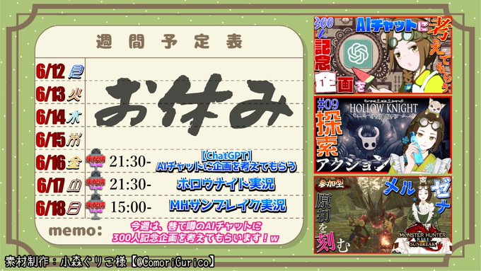 🐉#配信スケジュール✨ おはたつ~🥞 今週の竜輝さんは、ChatGPT配信、ホロウナイト実況、モンハン実況の3本です🎙️ よければ、配信や動画も観に来てね♪😆 ▶️Youtube:https://t