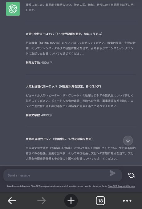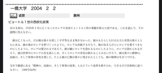 ︎︎ChatGPTに一橋世界史の問題作らせてみたら,2004年の類題出してきて神😇。他の問題も面白そう
