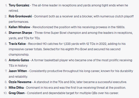 I had ChatGPT rank the top 10 tight ends in NFL history