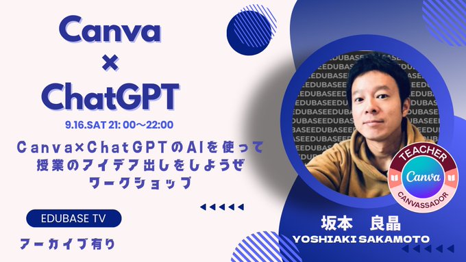 来週のEDUBASE TVはCanva×ChatGPT ①ルーレットにより決められたテーマに対してChatGPTを使い授業のアイデアを40秒で考える ②みんなで作文を書いて全員分をChatGPTで秒で添削、観点ごとに点数化した上でCanvaでエア卒業文集にする という変態回になります。 #EDUBASE https://t