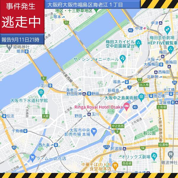 【速報】大阪市福島区海老江で女性がナイフを持った男に現金を奪われる事件が発生。犯人は黒色キャップ帽とマスクを着用し、160センチメートルくらいの中肉の男。不審者を見かけたら110番通報。