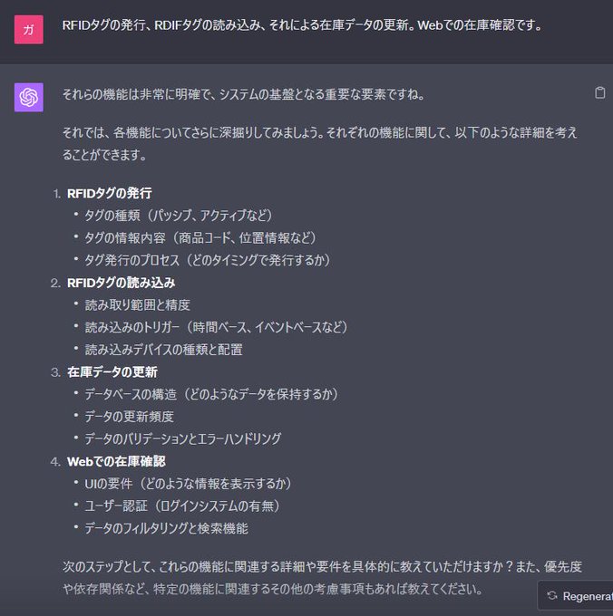 要件定義にChatGPTは使えるのか?ChatGPTにSEになってもらいインタビューしてもらう。適当な段階でWord形式の要件定義書として出力。たたき台として項目追加。 いい感じになったら、ChatGPTにその要件定義書(word)を喰わせて再質問を繰り返して内容を厳密にしていく。結論十分に使える。