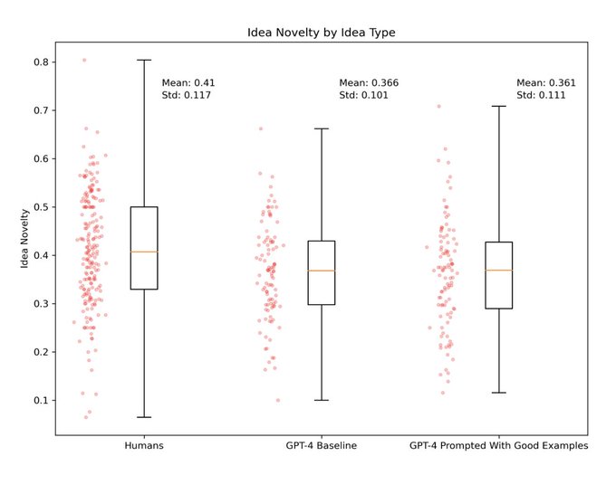 ペンシルベニア大学ウォートン・スクールでMBA生とChatGPTに新しいスタートアップのアイデアを出すチャレンジ企画を行った中、ChatGPTはスピードでもクオリティでもMBA生に勝った。 平均的な回答だけではなく、最も良いと思われたアイデアもChatGPTから来ていた。 https://t