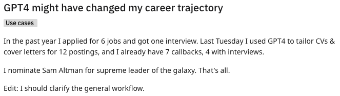 昨年: 6件 求人に応募 1件 面接 今年: 12件 求人に応募 7件 返信あり 4件 面接 ←イマココ ChatGPTに大感謝 彼は何をしたのか?